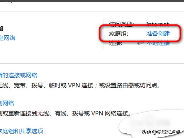 2、进入网络和共享中心后,点击页面右边家庭组后面的准备创建。页面弹出网络选择,点击任意网络。