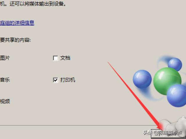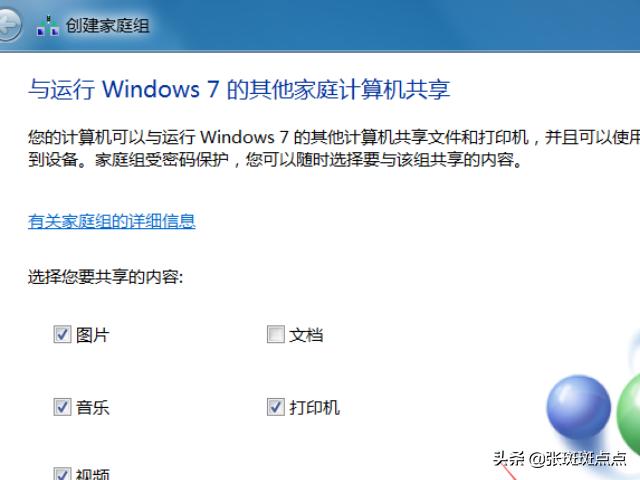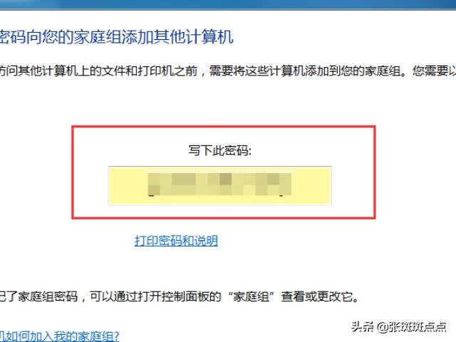 3、进入创建家庭组页面,勾选共享的内容,按默认的设置即可,直接点击下一步。页面弹出家庭组的加入密码,记下此密码,点击完成,这样家庭组就创建成功了。