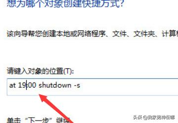 3、然后需要在这个界面里输入:【at 19:00 shutdown -s】在对象位置,如图所示。