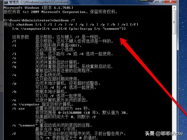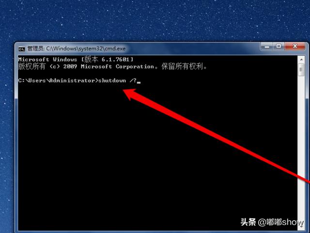 3、在命令窗口,输入shutdown /?命令,查询命令的用法。