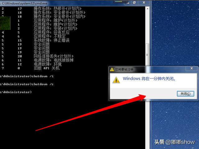 7、输入命令后点击回车按钮,系统提示系统在一分钟后关机。