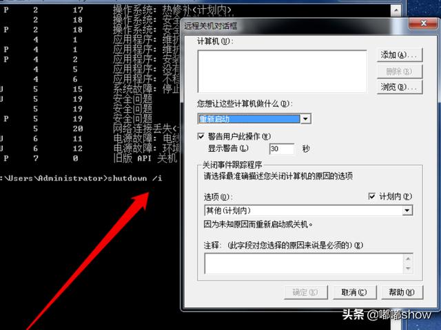 5、在CMD命令窗口,输入shutdown /i 可以显示可视化窗口,进行关机操作。