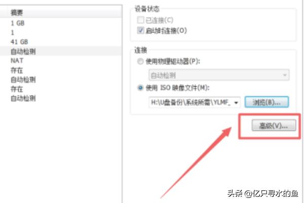6.然后回到一个中点击 CD/DVD 选项;在打开的页面中选择为 使用ISO镜像文件 ,找到刚才准备好的win7系统镜像文件;然后点击下面的高级,选择为第三个, 也就是IDE,点击 确定。下面就开始安装win7系统了。