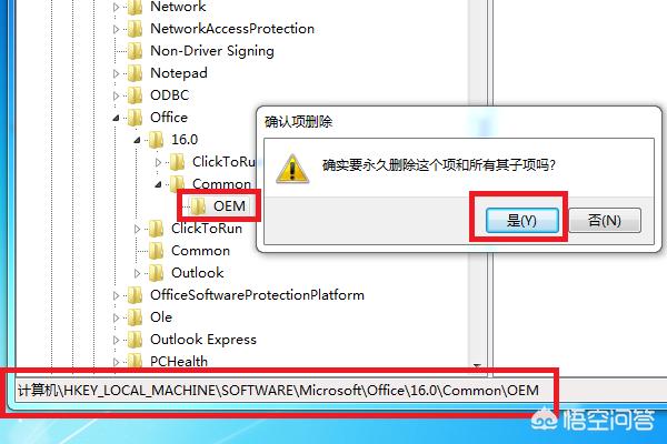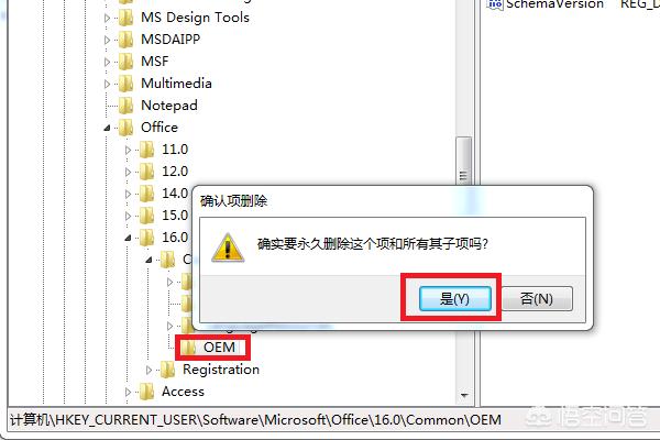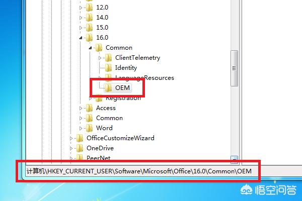 6、依照上面的方法,通过依次点开HKEY_LOCAL_MACHINE\SOFTWARE\Microsoft\Office\16.0\Common\OEM,把另一个“OEM”文件也删除,到这问题解决。