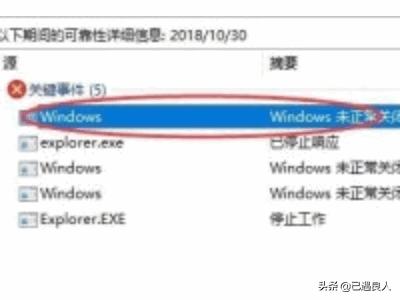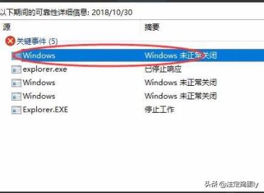7. 我们需要先找到explorer.exe,这个代表了我们的资源管理器未响应,然后查看离这个事件最近的事件,我们可以看到错误原因是windows未正常关闭。如图所示