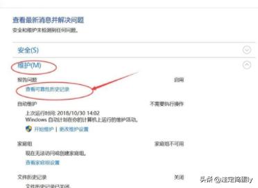 3.进入界面之后,我们可以选择安全或者维护选项,这次我们需要选择维护选项,点击打开选项,在弹出的下一级菜单中,打开第一个选项“查看可靠性历史记录”。如图所示