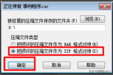 4.在弹出的窗口中,选项“文件夹”保存的位置,勾选“把损坏的压缩文件作为ZIP格式能对待”,点击“确定”按钮。