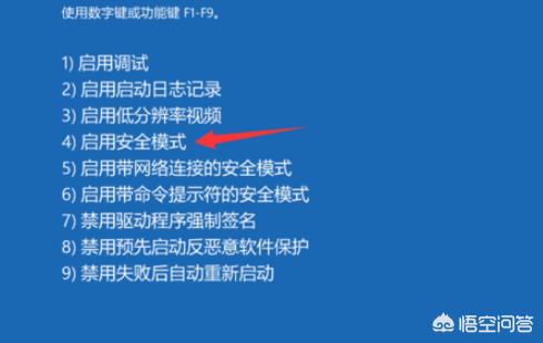 4、接着点击”重启“按钮。电脑就会自动重启,出现启动设置界面下图所示,通过按F1-F9来选择启动的选项,按F4就可以进入安全模式了。