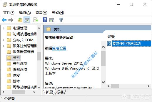 打开组策略编辑器,在左侧导航窗格中依次展开“计算机配置 - 管理模板 - 系统 - 关机”,在右侧窗格中即可看到“要求使用快速启动”策略设置项。