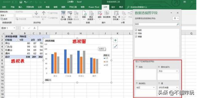 Excel中,还有一个很强大的图表,数据透视图,这,适用于直接从数据源直接统计分析,直接制作图表,如下所示: