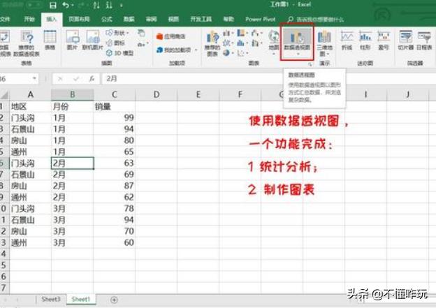 插入数据透视图,一个功能直接完成,统计分析 制作图表,直接省去统计分析这个中间步骤,如下所示: