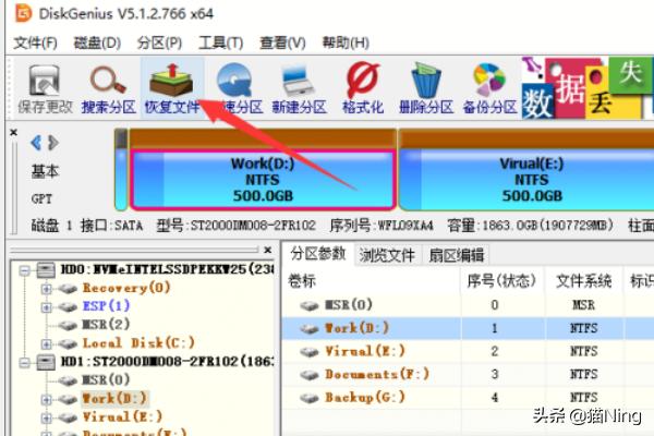 选中无法打开的移动硬盘分区,然后点击“恢复文件”按钮。