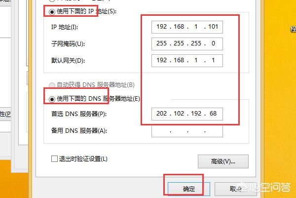 5、然后在弹出的选项中勾选使用下面的IP地址,并在IP地址里面输入如192.168.1.1101(与路由器的号段保持一致)以及网管和掩码。再勾选下面的使用DNS服务器地址,输入202.102.192.68点击确定就可以解决该问题了。