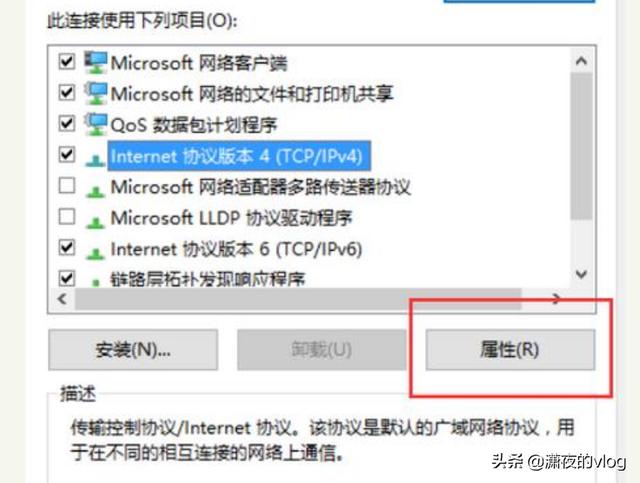 4.点击internet协议版本4(TCP/IPv4)点击属性。