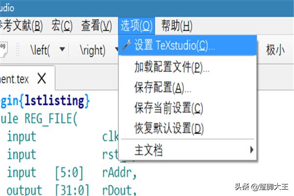 1.首先选择菜单栏的选项(英文下是options),点击设置TeXstudio。