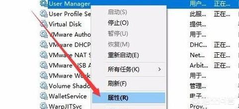 3、进入服务主界面,在列表找到User Manager选项并选中,鼠标右键选择属性选项进入。