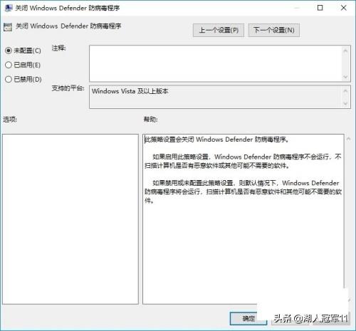 3、在windows Defender设置里面双击打开【关闭windows Defender 防病毒程序】,选择【已启用】,然后单击应用。