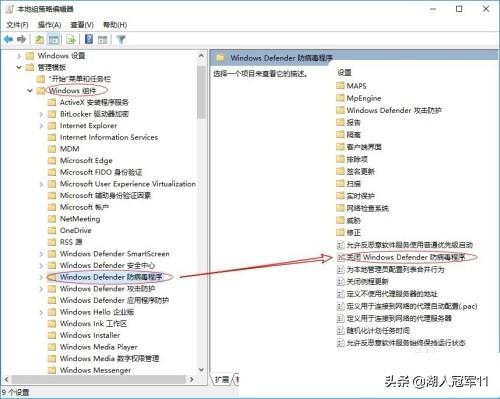 2、在打开的组策略窗口中,依次展开计算机配置>管理模板>Windows组件,选择【windows组件】中的windows Defender 防病毒程序。