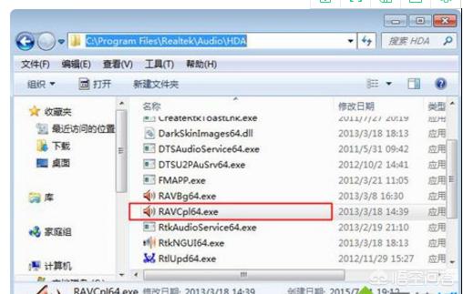 4、如果控制面板没有管理器选项,则进入C:\Program Files\Realtek\Audio\HAD目录,双击打开RAVCpl64.exe;并在Realtek高清晰音频管理器右上角,点击黄色文件夹图标,它是插孔设置图标;