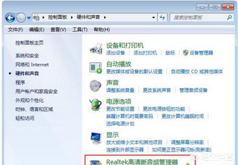 3、如果声音图标依然打红叉,则依次点击开始按钮—控制面板—硬件和声音—Realtek高清晰音频管理器;