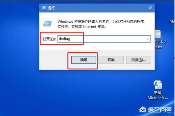 4、在弹出的运行框里输入dxdiag,然后点击下面的确定按钮;