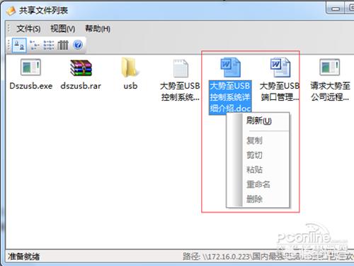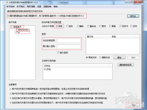 注:如果觉得配置复杂,也可以使用一些共享文件夹管理软件、共享文件夹权限设置软件来设置共享文件夹的访问,例如有一款“大势至共享文件夹管理软件,可以轻松设置共享文件夹各种访问权限,可以只让读取而禁止复制共享文件的内容(例如word)、禁止另存为本地共享文件或打印共享文件,同时被加密的共享文件只能在特定共享文件列表框内查看,从而也可以阻止通过U盘、网盘、FTP、QQ发文件的方式将共享文件发送出去,从而彻底保护了共享文件的安全。如下图所示: