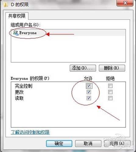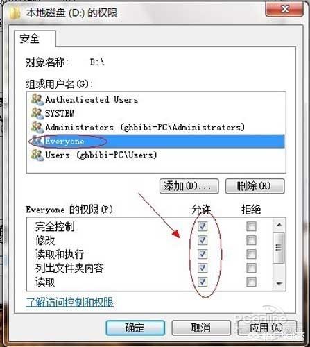 观察上图“组或用户名”下面应该有个everyone的用户,如果没有,点击“添加”添加该用户,下面的everyone的权限如图设置即可。