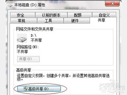 然后选择需要共享的磁盘分区或者文件夹,点击右键“属性”-“共享”-“高级共享” 下图。